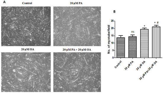 PMSCs grown in a growth medium (with 10% FBS) were switched to a differentiation medium (with 5% horse serum) to induce differentiation and were treated with PA and OA for 5 days to examine the effects of PA and OA on muscle differentiation. Myotubes with two or more nuclei were observed in PA-alone- and OA-alone-treated groups (Figure 5B). The number of myotubes in the OA-alone- and PA + OA-treated groups were significantly higher (p < 0.05) than that in the control and PA-alone-treated groups (Figure 5B).