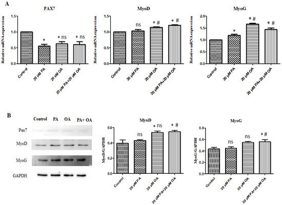 (A) Gene expression levels of myogenesis transcription factors under PA, OA, and PA + OA treatments. (B) Protein expression levels of myogenesis transcription factors under PA, OA, and PA + OA treatments. Values are means ± SE, n = 3. * Indicates significance between treatment groups vs. control (p < 0.05), # Indicates significance between OA/PA + OA groups vs. PA group (p < 0.05), and ns indicates no significant difference. The control group consisted of porcine satellite cells that were untreated (no PA or OA).