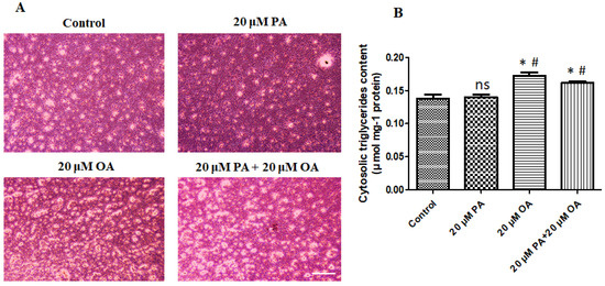 As shown in Figure 7B, the supplementation of OA, both alone and with PA, significantly stimulated TAG accumulation in treated PMSCs (p < 0.05) compared with that in the control and PA-alone-treated PMSCs.