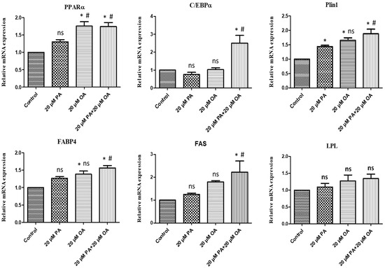 Gene expression levels of adipogenesis transcription factors under PA, OA, and PA + OA treatments. Values are means ± SE, n = 5. * Indicates significance between treatment groups vs. control (p < 0.05), # Indicates significance between OA/PA + OA groups vs. PA group (p < 0.05), and ns indicates no significant difference. The control group consisted of porcine satellite cells that were untreated (no PA or OA).
