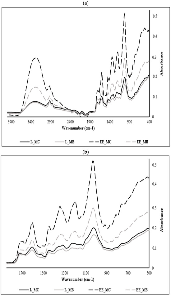 Mid-infrared spectra registered of powders and ethanolic extracts of M. communis leaf control and by-product: (a) Mid-infrared spectra registered between 4000 and 400 cm−1; (b) Mid-infrared spectra registered between 1700 and 500 cm−1. L_MC: M. communis control leaf powder, L_MB: M. communis by-product leaf powder, EE_MC: Ethanolic extract obtained from M. communis leaf control, EE_MB: Ethanolic extract obtained from M. communis leaf by-products. Each bar is the mean of 3 independent trials ± S.D.