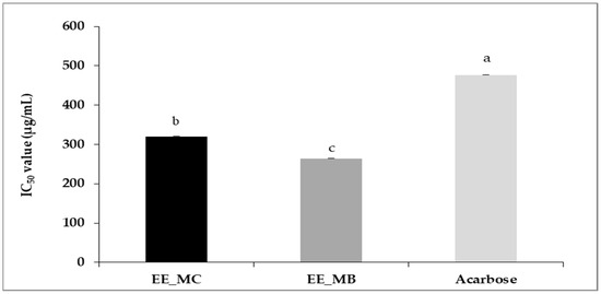 IC50 values of anti-α-amylase activity (μg/mL) of ethanolic extracts of M. communis leaf control (EE_MC) and by-product (EE_MB). EE_MC: Ethanolic extract obtained from M. communis leaf control; EE_MB: Ethanolic extract obtained from M. communis leaf by-products. Values are the mean of 3 independent trials ± S.D. The mean IC50 values of anti-α-amylase activity (μg/mL) of samples followed by different lowercase superscript letters are significantly different (p < 0.05).
