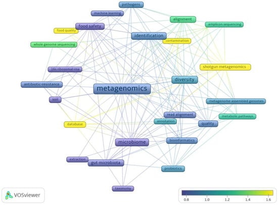 An analysis was conducted on publications related to food metagenomics from 2018–2023, using VosViewer (Figure 1) [10]. The bibliographic data of articles were retrieved from the Web of Science database. The analysis involved filtering results based on the keywords “food”, “metagenomics”, and “quality”. A co-occurrence network was established using 357 records from the past 5 years. The frequency of occurrences served as samples, resulting in 28 terms after excluding closely related ones. The input data for the network included full records and references cited. The size of each occurrence in the diagram corresponds to its frequency in publications. The color spectrum reflects the average normalized number of citations received by documents containing a specific term. Notably, articles featuring “shotgun metagenomics” and “database” garnered the highest number of citations, indicating researchers’ interest in research methodologies within the realm of “food quality”. Similarly, articles discussing untargeted sequencing details such as “amplicon sequencing”, “whole genome sequencing”, and “alignment” received significant attention, contrasting with the lower citation rate for articles mentioning “16S ribosomal RNA”, a targeted sequencing method. The limited occurrences and citations for terms such as “machine learning” and “extraction” suggest a research gap in the field of food metagenomics.