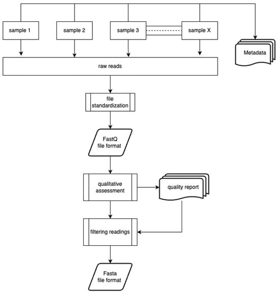 Files in the FASTQ format (Illumina, 454/Roche) can undergo qualitative evaluation through the utilization of the FASTQC software from https://www.bioinformatics.babraham.ac.uk/projects/fastqc/ (accessed on 13 July 2024). FASTQC is responsible for generating a total of ten visual representations aimed at assessing the quality of the file. The outcomes are stored in HTML format and are amenable to visualization through a web browser. Subsequent to this, the process of filtering results based on suitable quality parameters can be executed by employing trimming software such as SeqTrim [62], EA-Tools [63], and Trimmomatic [64].