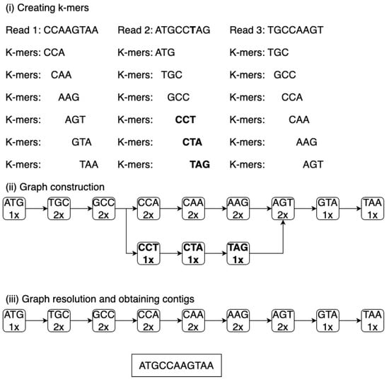 The prevalent approach utilized is based on the de Bruijn graph. This graph is formulated by disintegrating each read into overlapping fragments of a consistent length, known as k-mers. These k-mers establish the vertices and edges of the de Bruijn graph. Subsequently, the software traces a route within the graph, consequently ascertaining the accurate genomic sequence. The emergence of branches in the graph, which complicates the identification of the correct sequence, is attributed to sequencing inaccuracies, fluctuations in coverage, the existence of repetitive sequences, and various other structural variations [69].