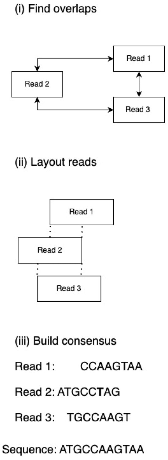 Overlap, layout, and consensus. Overlapping reads; (i) searching for overlapping read fragments. (ii) Layout reads determine the assembly of reads into contigs by considering coverage (dashed lines indicate overlapping fragments). (iii) The most probable nucleotides are selected for sequence construction.