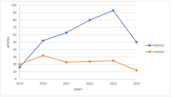 Mothur [138] and Qiime2 [139] are widely used solutions in bioinformatics analysis, offering flexibility in parameter adjustments. Mothur, initiated in 2009 by Dr. Patrick Schloss at the University of Michigan, provides an integrated platform for ecological research through a command line interface, while Qiime2, designed with a plugin system, allows operation via API, graphical interface, and command line for decentralized use. Figure 7 illustrates a graph presenting the citation frequencies of Qiime2 and Mothur in scholarly articles from the last 5 years, based on data obtained from PubMed on 7 July 2024.