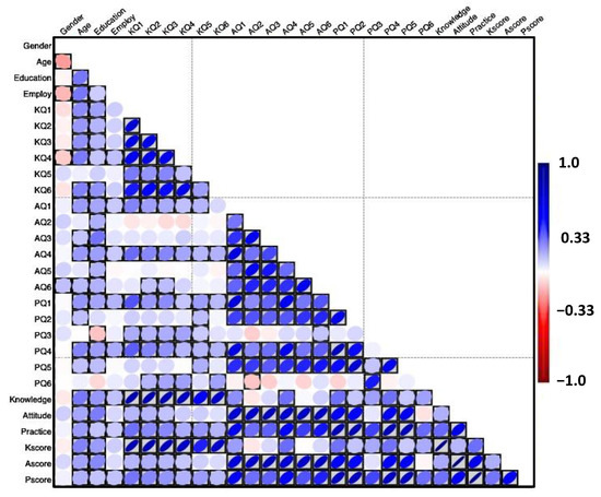 Blue-red heatmap presenting the Pearson’s correlation coefficient for the interrelationships between gender, age, education, employment, and total knowledge, attitude, and practice scores.
