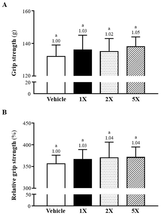 Effects of Chlorich®EnergyBoost supplementation on (A) Forelimb Grip Strength and (B) Relative Forelimb Grip Strength (%), calculated as a percentage of body weight. The supplementation levels for the Chlorich®EnergyBoost groups are denoted as 1X (One fold), 2X (Two fold), and 5X (Five fold), with the vehicle group serving as the control. All results are presented as mean ± SD (n = 6 mice per group). The presence of distinct superscript letters above each bar indicates statistically significant differences between the experimental groups (p < 0.05).