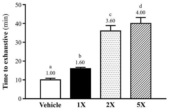 The outcomes of the exhaustive swimming test, illustrated in Figure 2, exhibited notable enhancements in exercise performance within the Chlorich®EnergyBoost supplemented groups compared to the vehicle group. Specifically, the recorded swimming durations were 10.0 ± 0.9 min for the vehicle group, 16.0 ± 0.7 min for 1X, 36.0 ± 2.9 min for 2X, and 40.0 ± 3.2 min for 5X. The observed performance improvements were substantial, with 1X, 2X, and 5X showcasing exercise capacities 1.6 times (p = 0.0002), 3.6 times (p < 0.001), and 4.0 times (p < 0.0001) greater than that of the vehicle group.
