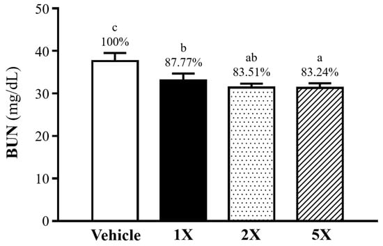 Effect of Chlorich®EnergyBoost Supplementation on Blood Urea Nitrogen Levels in Mice. The decrease in BUN levels among the experimental groups: 1X (One fold), 2X (Two fold), and 5X (Five fold), with the vehicle group serving as the control. All results are presented as mean ± SD (n = 6 mice per group). Distinct superscript letters (a, b, c) above each data bar indicate statistically significant differences between the groups (p < 0.05).