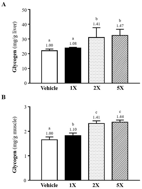 (A,B) Effects of Chlorich®EnergyBoost Supplementation on Muscle and Hepatic Glycogen Levels. Data are reported as mean ± SD (n = 6 mice per group). Chlorich®EnergyBoost supplementation levels are categorized as 1X (One fold), 2X (Two fold), and 5X (Five fold), with the vehicle group serving as the blank control. The presence of different superscript letters (a, b, c) above each bar indicates statistically significant differences.