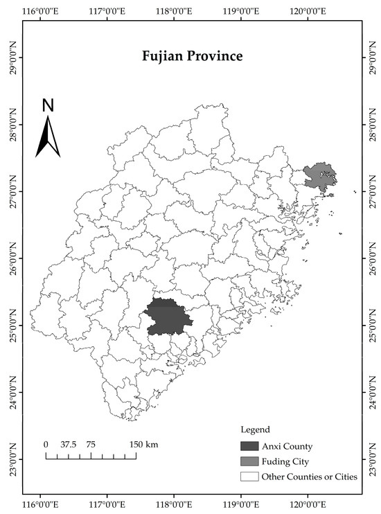 The ATTCS is a comprehensive agricultural production system centered around the traditional Tieguanyin variety. It integrates breeding, planting, cultivation, protection, harvesting, and tea culture, fostering biodiversity, ecosystem functions, and a unique human–nature landscape. As the origin of oolong tea, it was identified as a China-NIAHS in 2014 and designated as a GIAHS site by the FAO in 2022. The ATTCS is located in Anxi County of Quanzhou City in the southeastern of Fujian Province, China, and mainly includes Lutian Town, Xiping Town, and Huqiu Town (Figure 2). The geographical location of Anxi County is 117°36′~118°17′ E, 24°50′~25°26′ N, and mountains and hills dominate its terrain. The climate of Anxi County is a subtropical maritime monsoon, with an average annual rainfall of 1782.4 mm. Due to its geographical location and favorable natural ecological conditions, Anxi County is the largest tea-producing county in China, also known as the Chinese tea capital. In 2022, the area of tea gardens in Anxi County was 43,552.60 hectares, and the per capita disposable income of rural residents of Anxi County was CNY 22,341 (equivalent to USD 3321.66). It was estimated that more than 900 thousand people worked in tea-related industries in Anxi County in 2022.