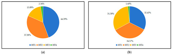 Combined with the field investigations, households in the ATTCS and FWTCS were classified into four types according to the proportion of agricultural income in household income: pure agricultural households (HT1), agricultural part-time households (HT2), non-agricultural part-time households (HT3), and non-agricultural households (HT4). In the ATTCS, the number of HT1 and HT2 households accounted for 44.49% and 37.38%, respectively, and the total accounted for 81.87%, indicating that their livelihood strategies were still more dependent on agriculture. This result is mainly because the tea industry chain in the ATTCS is relatively long, and more farmers can engage in tea planting, processing, selling, and other links. For FWTCS households, the numbers of HT1, HT2, and HT3 households were relatively close, accounting for 32.45%, 34.57%, and 31.38%, respectively, indicating that their livelihood strategies tended to be part-time. The number of HT4 households in the ATTCS and FWTCS were the lowest (Figure 3). Therefore, considering the small sample size of HT4 households, the subsequent analysis primarily focuses on the livelihoods of HT1, HT2, and HT3 households.