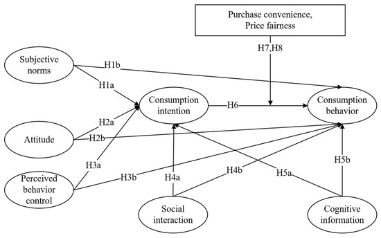 Considering the assumptions mentioned above, this paper constructs a model to examine the influencing factors of organic food consumption intention and behavior, as depicted in Figure 1. From the perspective of individual consumers, a structural equation model is employed to analyze the formation mechanism of organic food consumption intention and behavior, as well as the strength of the relationships between variables. Furthermore, the impact of social interaction and cognitive information on consumer behavior is considered. Additionally, the attributes of organic food itself are taken into account. Previous research has shown that the attributes of organic food have a positive regulatory effect on the intention to engage in behavior. Accordingly, this study focuses on two main attributes, namely, price fairness and purchase convenience, to investigate their regulatory effects.