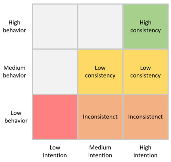 - Re-marking. Intention is categorized as low, medium, or high. Data with a value less than 3 are recorded as low, data with a value of 3–4 are recorded as medium, and data with values of 4–5 are marked as high. Behaviors are similarly categorized into low behavior, medium behavior, and high behavior. To facilitate the follow-up work, the difference between intention and behavior values can be measured by numerical distance ranging from zero to two, where zero represents inconsistency, one represents low consistency, and two represents high consistency.