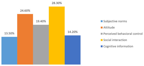 The results of the hypothesis test are presented in Table 6. Each path in the table is significant, confirming the acceptance of hypotheses H1–H6 proposed earlier. The most influential factor on consumption intention is social interaction (β = 0.264, p < 0.001), followed by attitude (β = 0.257, p < 0.001) and cognitive information (β = 0.230, p < 0.001). This suggests that consumption intention for organic food is influenced not only by consumers’ attitudes but also by social interaction and cognitive information. Directly changing consumers’ attitudes is more challenging, but modifying information interactions within society is relatively easy. The most influential factor on consumer behavior is social interaction (β = 0.173, p < 0.001), followed by attitudes (β = 0.154, p < 0.001) and subjective norms (β = 0.152, p < 0.001). Social interaction has a strong impact on intention and behavior, suggesting that it can effectively narrow the gap between intention and behavior.
