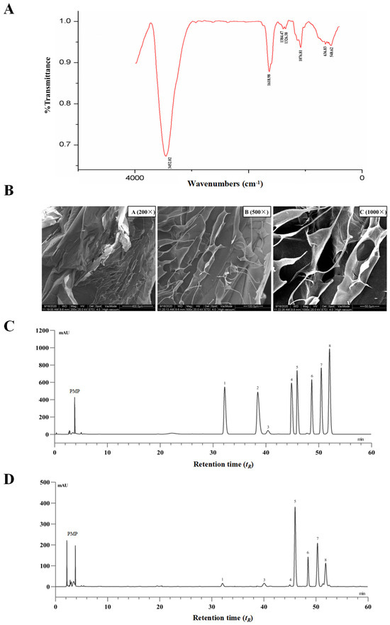 Chemical analysis of pectin from dietary Premna microphylla Turcz leaves (PTP). (A) FT-IR spectra. (B) Scanning electron microscope images at different magnifications. The HPLC chromatograms of PMP (1-pheny-3-methyl-5-pyrazolone) derivatives of eight standard monosaccharides (C) and component monosaccharides released by hydrolyzing PTP as pectin (D). Peaks: (1) mannose, (2) ribose, (3) rhamnose, (4) glucuronic acid, (5) galacturonic acid, (6) glucose, (7) galactose, (8) arabinose.