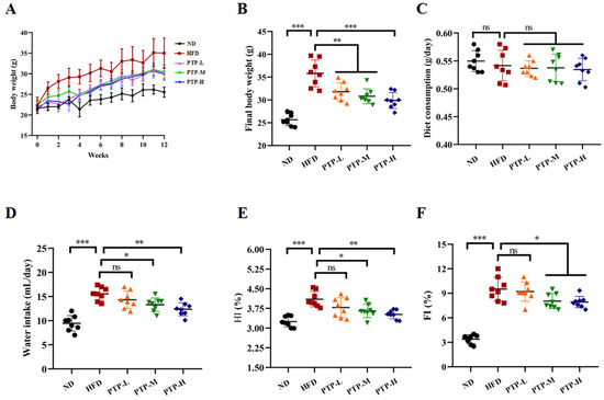 Following a 12-week period of normal diet (ND) or high-fat-diet (HFD) feeding, Figure 2A–F shows the changes in the tested mice’s body weight, food and water consumption, hepatosomatic index (HI), and fat index (FI). Prior to the trial, the body weight of the mice in the various groups did not significantly differ from one another. However, after 12 weeks, the mice fed the HFD had a considerable increase in body weight (p < 0.001, Figure 2B) compared to the ND mice, proving that the obesity model was successfully created. It is interesting to note that PTP at all tested dosages significantly reduced the weight gain in HFD-fed mice (p < 0.01, Figure 2A,B), and the effects of PTP at dosage of 400 mg/kg bw (PTP-H) were more significant than those of the other two dosages (p < 0.001, Figure 2B). Additionally, the intake of foods was tested during the experiments, and there was no discernible variation between the five groups (Figure 2C). In comparison with the ND group, being fed the HFD increased the mice’s water intake (p < 0.001), whereas the water intake of mice in the PTP-M and PTP-H groups was reduced obviously after the administration of PTP, relative to the HFD model group (p < 0.05 and p < 0.01, Figure 2D). In addition, compared to the untreated ND mice, the mice fed a 12-week HFD showed a significant rise in the hepatosomatic index (HI) and fat index (FI) (p < 0.001, Figure 2E,F). However, PTP administered at 200 mg/kg bw and 400 mg/kg bw markedly reduced the HI and FI of HFD-fed mice.(p < 0.05, Figure 2E,F).