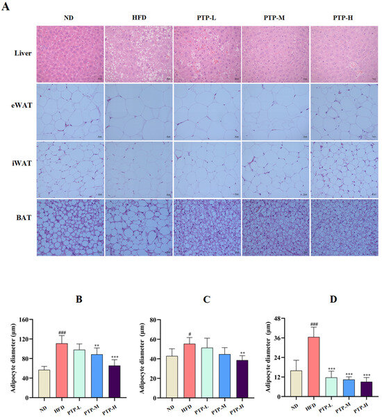 Effects of PTP on histopathological changes in hepatocytes in the liver and three different adipocytes stained with H&E, and original magnification 200×. The diameters of adipocytes were determined by ImageJ software (version 1.54) (n = 8 per group). (A) Histopathological alterations of the livers and the adipose tissues stained by H&E (original magnification of 400×). (B–D) The diameters of epididymal white adipose tissue (eWAT) and inguinal white adipose tissue (iWAT) as well as brown adipose tissue (BAT), respectively. # p < 0.05 and ### p < 0.001, versus the ND mice. ** p < 0.01, and *** p < 0.001, versus the HFD mice.
