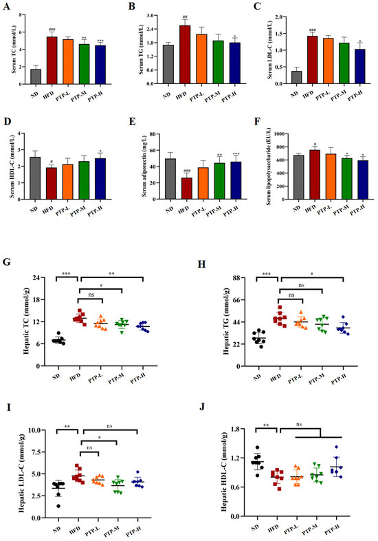 Effects of PTP on lipid metabolism and its related factors, adiponectin (ADPN) and lipopolysaccharide (LPS), in HFD-fed mice. (A–F) Serum TC, TG, LDL-C, HDL-C, ADPN, and LPS levels. (G–J) Hepatic TC, TG, LDL-C, and HDL-C levels. Data are expressed as mean ± SD (n = 8 per group). One-way ANOVA followed by Tukey’s multiple comparisons test were performed for all groups. # p < 0.05, ## p < 0.01, and ### p < 0.001, versus the ND mice. * p < 0.05, ** p < 0.01, *** p < 0.001 and ns indicates no significant difference, versus the HFD mice.