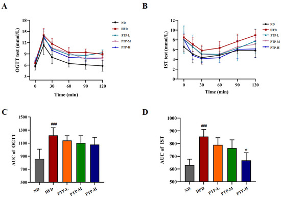 Furthermore, the oral glucose tolerance test (OGTT) and insulin sensitivity test (IST) were conducted after oral glucose or insulin injection for investigating whether PTP might exert efficacy on glucose homeostasis in HFD-fed obese mice (Figure 5A,B). The area under the curve (AUC) of the OGTT and the AUC of the IST for all the tested mice were calculated by software GraphPad Prism. As displayed in Figure 5C,D, within 120 min, mice fed the HFD showed a considerably greater glycemic response to oral glucose than mice fed the ND (p < 0.001). The intervention of PTP reduced the AUC in HFD-fed mice, but the effects were not statistically significant (p > 0.05). Nevertheless, the HFD model mice exhibited insulin resistance in the IST (p < 0.001). It was interesting to note that the HFD-induced drop in insulin sensitivity was significantly improved by high-dose PTP treatment as reflected by the decreased glucose levels during the IST (p < 0.05). These findings suggest that PTP protects against insulin resistance in mice that is brought on by an HFD in mice.