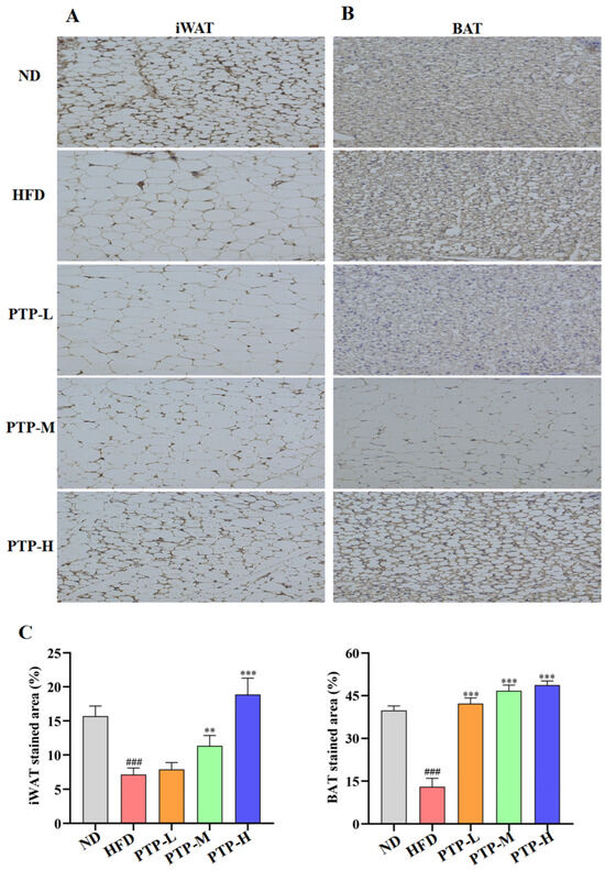 To investigate whether the regulatory effect of PTP on lipid metabolism was related to the energy expenditure, the thermogenic protein UCP1 was expressed in iWAT and BAT and was observed by immunohistochemistry (IHC) on eight samples from each group. As described in Figure 6, the IHC-stained cells can be seen as yellow/brown positivity, and the expression of UCP1 protein in HFD-fed mice is clearly decreased in comparison to that in ND mice (p < 0.001 vs. ND group). However, the UCP1 protein in iWAT and BAT was remarkably enhanced in the PTP-treated mice as compared to that in HFD-fed mice (p < 0.001). Figure 6A,B further demonstrate the quantitative results for the IHC-stained areas of UCP1 expression in the mouse iWAT and BAT, and feeding the mice the HFD could obviously decrease the protein UCP1’s expression in iWAT and BAT (p < 0.001 vs. ND control). As expected, PTP treatment prominently increased the UCP1 protein expression in the iWAT and BAT of mice in comparison with the HFD-fed mice, and PTP administered at 400 mg/kg bw was more effective than the other two dosages of PTP in increasing the UCP1 expression within the iWAT of HFD-fed mice (p < 0.001), indicating that PTP as pectin may encourage the browning of white fat by activating BAT’s thermogenic activity. This observation indicated that PTP prevented HFD-induced obesity possibly through the activation of adipose thermogenesis to increase energy expenditure.