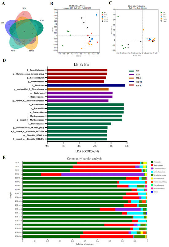Effects of PTP on intestinal microflora structure of mice fed with HFD. (A) Venn diagram of bacteria detected at the ASV level. (B,C) Beta diversity analysis of intestinal microbiota using the non-metric multidimensional scaling (NMDS) and principal co-ordinates analysis (PCoA). (D) LEfSe analysis of microbiota. (E) Bacterial community at the phylum level.