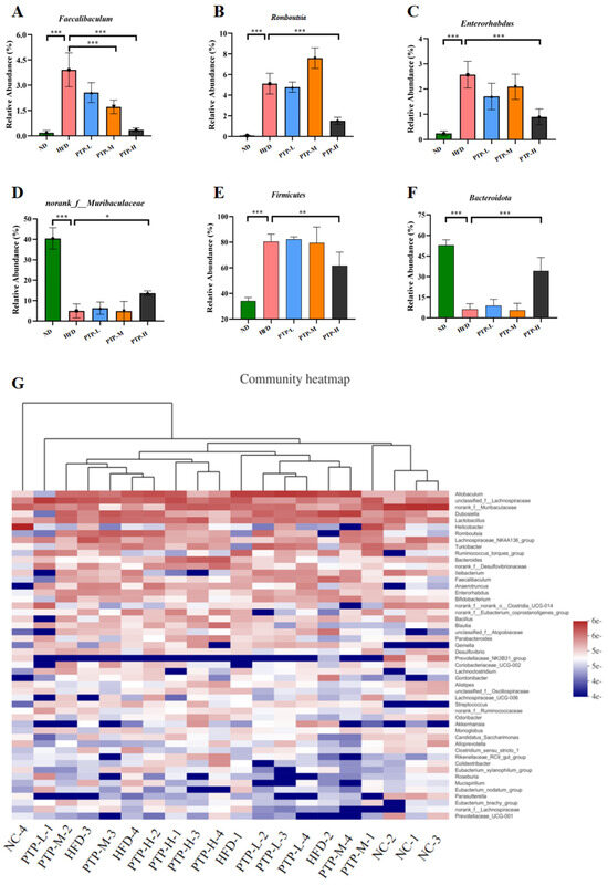 Effect of PTP on the abundance of intestinal flora in HFD-fed mice. (A) Relative abundance of Faecalibaculum at the genus level. (B) Relative abundance of Romboutsia at the genus level. (C) Relative abundance of Enterorhabdus at the genus level. (D) Relative abundance of norank-f-Muribaculaceae at the genus level. (E) Relative abundance of Firmicutes at the phylum level. (F) Relative abundance of Bacteroidota at the phylum level. (G) Heatmap comparison and hierarchical clustering dendrogram based on the relative abundance at the genus level. One-way ANOVA followed. * p < 0.05, ** p < 0.01 and *** p < 0.001, versus the HFD mice.