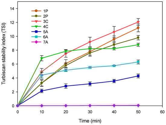 The physical stability of the coarse emulsions by the TSI stability index is shown in Figure 1. The changes in the TSI show the effect on the components of the seven formulations tested. In the 1P and 2P formulations, the amount of pectin was varied, keeping the amount of sodium caseinate and rice bran oil constant. The stability index shows a lower value when the amount of pectin is increased (0.7 g). In formulations 3C and 4C, two amounts of sodium caseinate were tested, with the amount of pectin and rice bran oil kept constant. In this formulation, the greatest amount of sodium caseinate (7 g) shows better stability. For Formulations 5A and 6A, the amount of oil was varied, keeping constant the amount of emulsifiers. In this formulation, the amount of emulsifier (stabilizing material) and oil was important to achieve longer stability times for both formulations. In Formulation 6A, the emulsifying material (7.7 g) is less than the oil (9 g), showing a higher value compared to Formulation 5A (7 g). This is also comparable with the previous formulations. In the 1P, 2P, and 3C formulations, the amount of oil was greater than the amount of emulsifier. On the other hand, in the 4C formulation in which the amount of emulsifier is greater than that of the oil, saturation occurs in the emulsified system, which in the long term can provide instability in the entire emulsified system []. Formulation 7A with the pH adjustment had the lowest index value of all formulations tested.