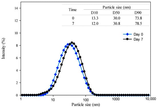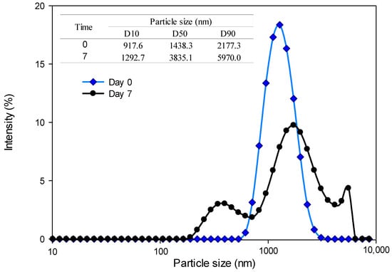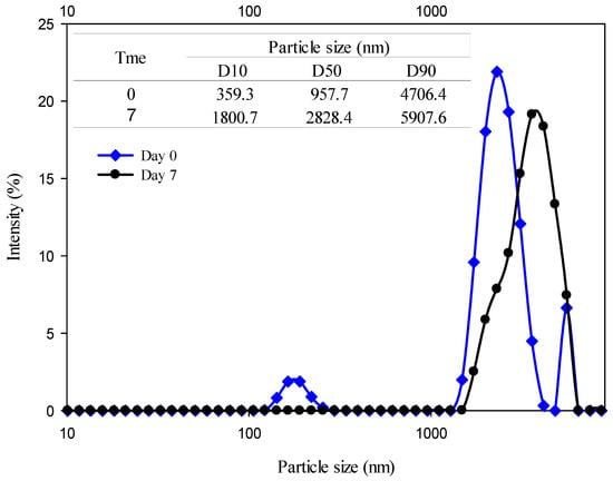 Particle-size distribution for the emulsion without treatment at Day 0 and Day 7 of storage.