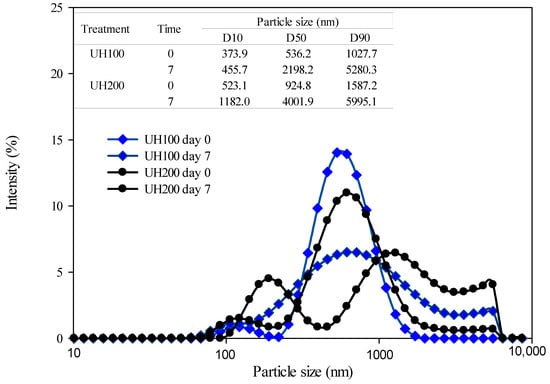 The UH100 and UH200 treatments presented average sizes close to 500 nm, and no statistically significant differences were observed when the pressure and storage-time effect were increased. However, when we look at the particle-size-distribution graph and the values of D10, D50, and D90 (Figure 4), the UH100 sample at Time 0 has a bimodal behavior with a small peak close to 120 nm, and a more prominent peak around 500 nm. This same sample on Day 7 of storage showed an enlargement of the peak with a D50 value of 2198 nm, which corresponds with the increase in the PDI value. On the other hand, the sample subjected to a pressure of 200 MPa (UH200) also presented a bimodal curve at Time 0. However, the values of D10, D50, D90, and PDI were superior to those of the UH100 sample, indicating that although both treatments had a similar average size, the UH200 sample had particle populations with more heterogeneous sizes. By Day 7, both treated emulsions had an increase in particle size and heterogeneity, showing a flatter bimodal curve with an increase in the values of D10, D50, D90, and PDI compared to the UH100 sample at the same storage time.