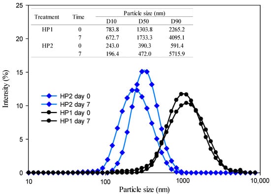 Particle-size distribution for the emulsion with the high-pressure treatments at 100 MPa with one cycle (HP1) and two cycles (HP2) at Day 0 and Day 7 of storage.