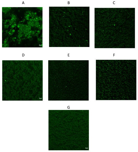 The image analysis of the emulsions without high-energy treatment and emulsions with high-energy treatments are shown in Figure 7 For the emulsion without high-energy treatment (Part A of the figure), it can be noted that the droplet formation throughout the analyzed suspension shows a larger particle size. The most noticeable difference in the emulsions with high-energy treatment with the use of pressure (Figure 7B–F) is the presence of dots with an intense green autofluorescence caused by protein aggregates through all the analyzed suspensions. The presence of aggregates is much more noticeable in the emulsion produced with the conventional homogenization (Part A of the image) and the emulsion with the ultra-high-pressure treatment at 200 MPa (Figure 7F), in which the largest particle size was found. This can be related to the protein aggregates that other authors mentioned [,]. For this, Fernández–Ávila et al. [] mentioned that in emulsions stabilized with protein and treated by high pressures, it is common to observe some protein denaturation causing the formation of aggregates, larger particle sizes, and early destabilization phenomena.