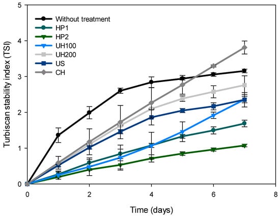 The high-pressure treatments (HP1 and HP2) had the highest stability with the lowest TSI value. For these two treatments, high pressure with two cycles (HP2) had the lowest TSI values and the best stability. Treatments that use more energy, such as ultra-high-pressure treatment (UH100 and UH200) and ultrasonic treatment (US), presented higher values in the TSI compared to high-pressure treatment, especially the treatment subjected to ultra-high pressure at 200 MPa (UH200). Finally, the emulsion with the conventional homogenization (CH) treatment had the lowest stability with the highest TSI values, showing that even for Days 6 and 7, the values were higher than the emulsion without treatment.