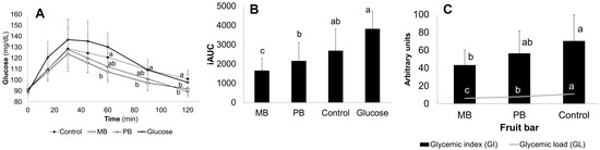 Regarding the in vivo assay of the glycemic response, the biological response observed in participants (A) could be partially explained by the fact that MB and PB had almost the same carbohydrate (sugars + starch: ~50 g.100 g−1) and total dietary fiber content (~30 g.100 g−1), statistically different from the control bar (~50 g and ~7.100 g−1, respectively). The soluble dietary fiber in a portion of food provides texture and viscosity; these influences inhibit the absorption of macronutrients and some blood lipids and can regulate postprandial glucose levels since gastric emptying is delayed [27]. From a mechanistic standpoint, the maximum glycemic peak often occurs within the first 30 min, most likely related to the intestinal absorption of free and rapidly hydrolyzed (from digestible polysaccharides) glucose more than a systemic hormonal control.