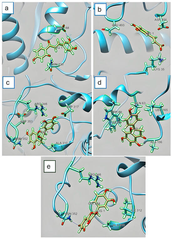 Figure 3 shows the molecular couplings of PC with the α-amylase enzyme. It was identified that the PC present is hydrophilic in different amino acids, which are not responsible for the catalytic activity, for which it is considered that there is an allosteric interaction. This is possible because the active site (substrate binding) of α-amylase is located in a long cleft between the carboxyl terminus of the A and B domains. Specifically, Figure 3a shows a hydrophilic interaction of butein with aspartic acid (Asp188) and asparagine (Asn220) residues of the α-amylase enzyme. Figure 3b presents the α-amylase–ferulic acid complex, with interactions of glutamic acid (Glu493) and lysine (Lys35) with ferulic acid. Figure 3c–e demonstrate the hydrophilic interactions of asparagine (Asn352) and aspartic acid (Asp317) with catechin; the interactions of glutamine (GLN63) with naringenin, and the interactions of the α-amylase–quercetin complex, that is, asparagine, (Asn352) with quercetin, respectively.