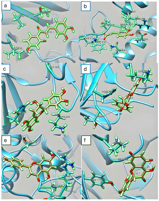 Molecular docking simulation obtained with the lowest energy conformation: α-glucosidase enzyme. (a) α-glucosidase–butein complex, interactions valine (val763), leucine (leu756) and threonine (thr764) with lig 1 (butein). (b) α-glucosidase–ferulic acid complex, interactions of phenylalanine (phe416), glutamic acid (glu505), glutamine (gln509) and lysine (lys418) with lig 1 (ferulic acid). (c) α-glucosidase–catechin complex, interactions of histidine (hsd799) with lig 1 (catechin). (d) α-glucosidase–kaempferol complex, threonine (thr848) interactions with lig 1 (kaempferol). (e) α-glucosidase–naringenin complex, interactions of serine (ser410) and methionine (met408) with lig 1 (naringenin). (f) α-glucosidase–quercetin complex, interactions of glycine (gly908) with lig 1 (quercetin).