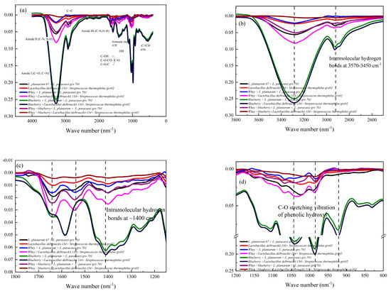 3.5. Analysis of Blueberry–Whey Protein Mixed Fermentation Bacteria by FTIR