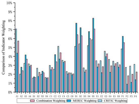 By employing the Critic method and MEREC method, as previously illustrated, to assign weights to the food security indicators, we can derive the weights for the six dimensions and the weights of each indicator within these dimensions. The assignment of weights in the Critic method is computed in accordance with Equations (1)–(5), while the assignment of weights in the MEREC method is computed following Equations (6)–(10). The weighting differences between the MEREC method and the Critic method are assessed using the Pearson correlation coefficient. [36]. The Pearson correlation coefficient of the weights between the two methods is 0.7569, which is significantly correlated at the significance level of α = 0.01. This indicates that the two methods are essentially consistent in assigning weights to food security indicators. To mitigate the discrepancies in the assignment of weights to individual indices between the two methods, this study employs a combination weighting approach grounded in cooperative game theory [50]. The combination weights are computed utilizing Equations (11)–(16). Figure 1 compares the three methods for assigning weights to indicators. As shown in Figure 1, the combination weights are actually a compromise between the weight assignments by the MEREC and CRITIC methods.