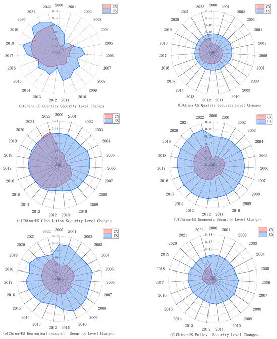 As illustrated in Figure 4a, the level of quantity security in China experienced minor fluctuations prior to 2004, subsequently rising year by year. The level of food quantity security in China has risen from 0.0434 in 2000 to 0.1031 in 2022, indicating a significant increase in magnitude. In comparison, the overall level of food quantity security in the United States is slightly higher than that in China. However, with the rapid development of China, this disparity is steadily diminishing. Notably, the quantity security in the United States has exhibited significant fluctuations, likely influenced by factors such as extreme weather, animal diseases, or pest infestations, indicating potential risks in its stability.