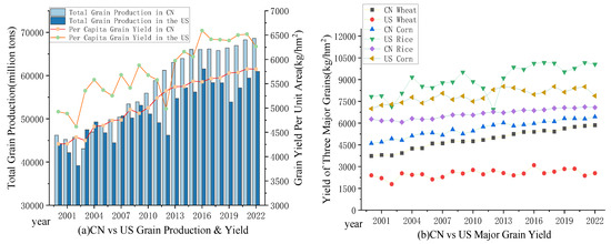 In this context, ensuring food security for a nation is of paramount importance. The task of ‘firmly holding the people’s rice bowl in one’s own hands’ is crucial. When it comes to global food security and sustainable development, the food security situation of China and the United States, as the two major nations, is undoubtedly a highly anticipated focus. As significant contributors to the global agricultural network and essential participants in the global agricultural system, China and the United States play crucial roles in safeguarding global food security. Moreover, the agricultural sector structures of both countries are quite similar, and both face many similar agricultural challenges, such as agricultural water supply issues, declining labor force, and food safety concerns related to genetically modified foods [10]. In-depth research into the food security situations of China and the United States contributes to advancing global food security governance and promoting human sustainable development.