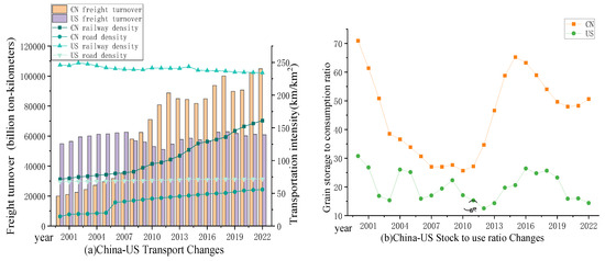 Food circulation acts as a bridge between food production and consumption, covering aspects like storage, transportation, sales, and trade. Ensuring the smooth supply of grains from producers to consumers is an indispensable segment in the grain supply chain. Circulation security focuses on addressing the issue of ‘available’. Food transportation is a crucial component of food circulation, and the current modes of grain transportation in China–US food logistics primarily rely on railways, roadways, and waterways [46]. Considering the difficulties in obtaining data on waterway transportation and food loss, this study selects the density of railway and highway transportation routes and their freight turnover indicators to indirectly measure the basic transportation capacity of food [34]. In terms of food storage and sales, this paper reflects on the grain reserve situation, and the emergency dispatching ability of grain during grain production is obstructed by calculating the stock to use ratio [29]. Additionally, the domestic per capita grain consumption is calculated to measure the food sales situation. The globalization of food trade effectively links the food security of various countries. The grain self-sufficiency ratio is calculated to reflect the degree of external dependence on grain, indirectly indicating the state of grain trade.