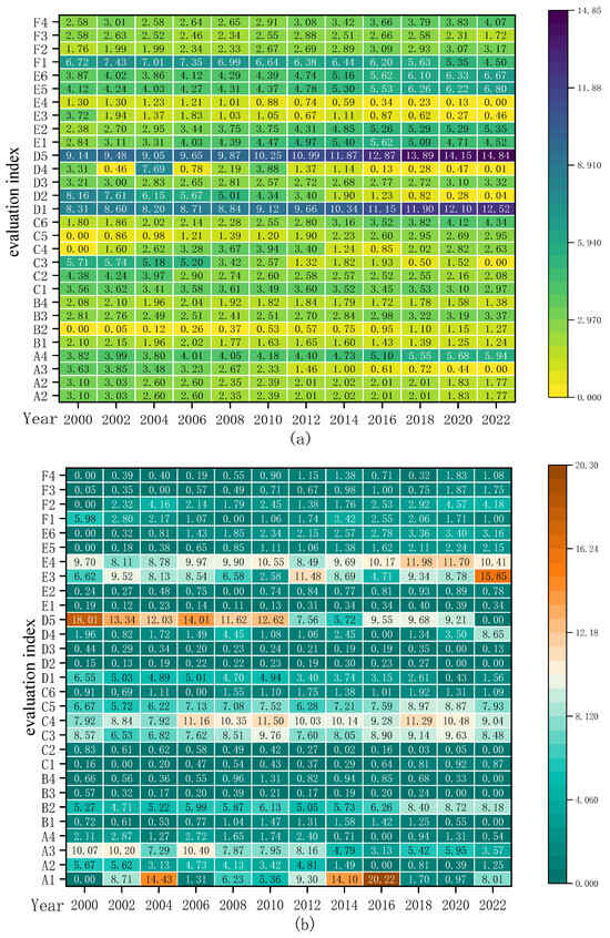 Based on Formulas (17)–(27) in the MARCOS model, the overall scores of the food security levels in China and the United States over the past 23 years have been calculated. Figure 2 depicts the evolution of the overall development level of food security in China and the United States from 2000 to 2022. The level of food security in the United States has shown noticeable fluctuations during this period, but the overall level is relatively high and exhibits a slow upward trend. Contrastingly, China began with a lower baseline of food security compared to the United States, yet it developed at a faster pace. During this period, China’s food security level demonstrated a slight fluctuation, but the overall level continued to improve, and the gap in the food security levels between China and the United States was gradually narrowing. As shown in the latest 2022 GFSI report, over the past decade, China’s food security score has seen a net increase of 13.7 points, ranking second in growth rate among 113 countries, while the United States has only increased by 1.3 points, thus narrowing the ranking gap between China and the United States [5]. This indirectly validates the reasonableness of the results of this study.