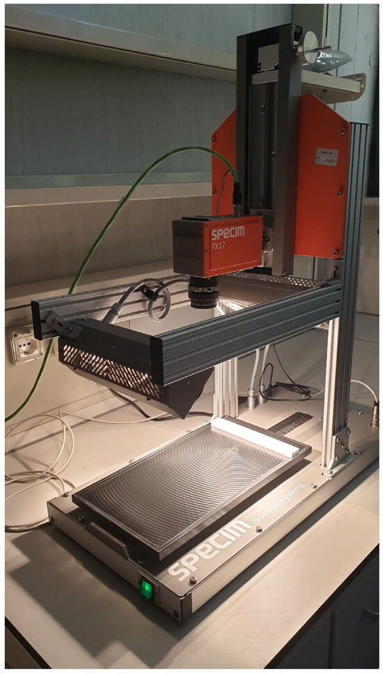 Shortwave infrared (SWIR) hyperspectral images of the algae samples (5 g of material in a Petri dish) were acquired in reflectance mode using a SisuCHEMA Hyperspectral Chemical Imaging Analyser (SPECIM, Spectral Imaging LTD, Oulu, Finland) system, as well described by Amoriello et al. [24]. The system (Figure 1) consists of a scanner table having a maximum scanning rate of 60 mm/s and a spatial resolution of 600 μm, with an integrated SPECIM diffusive line illumination unit, and a monochrome InGaAs image sensor detector (Specim FX17, Spectral Imaging Ltd., Oulu, Finland) with a spectral range of 935–1720 nm, a spectral resolution of 8 nm, and a spatial resolution of 640 pixels. The images were acquired and converted to spectral reflectance with Lumo-Scanner software (version 2022, Lumo-Scanner, Specim, Spectral Imaging Ltd., Oulu, Finland). The exposure time of the hyperspectral camera was set to 4.70 ms, the frame rate to 15.20 Hz, the positioning speed of the platform to 20.00 mm s−1, and the scanning speed to 5.84 mm s−1. The reflectance of the acquired hyperspectral images was calibrated using the white and dark reference images, according to the following equation: