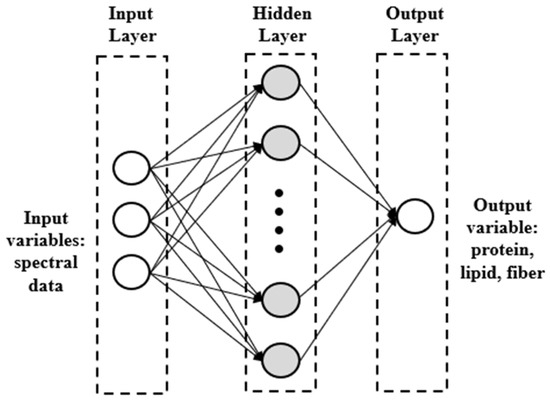 Three nutritional parameters (protein, lipid, and total fiber) were predicted using artificial neural network (ANN). The feed-forward architecture of the ANN, i.e., multilayer perceptron (MLP), combined with the Levenberg–Marquardt learning algorithm, was used to develop nonlinear models for the nutritional variables. The SWIR spectra of each algal sample represented the independent variables, and the dataset was randomly split into a training set (70% of the data), a testing set (15% of the data), and a validation set (15% of the data). The ANN architecture (Figure 2) was composed by three main layers: an input layer, which contains 164 spectral data, an output layer, i.e., the three nutritional parameters, and a hidden layer, as well described by Amoriello et al. [27].