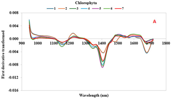 The SWIR first-derivatives spectra (935–1720 nm) were depicted in Figure 3 and contained information on different functional groups of the algae samples. The mean SWIR raw spectra of each algae sample are represented in Supplementary Figure S1. In general, the SWIR regions were mainly characterized by second-overtone spectral regions, which could be associated with the aliphatic chain (C–Hn), hydroxyl group (O–H), and aminic group (N–H) characteristics of complex carbohydrates (cellulose, lignin, etc.), lipids, water, and proteins [44].
