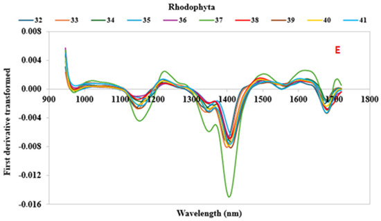 Mean first-derivative reflectance spectra between wavelengths of 935 and 1720 nm for 41 algae samples. Samples was clustered in relation to the phylum in five subfigures (A–E). The species of the samples identified by the numbers are reported in Table 1.
