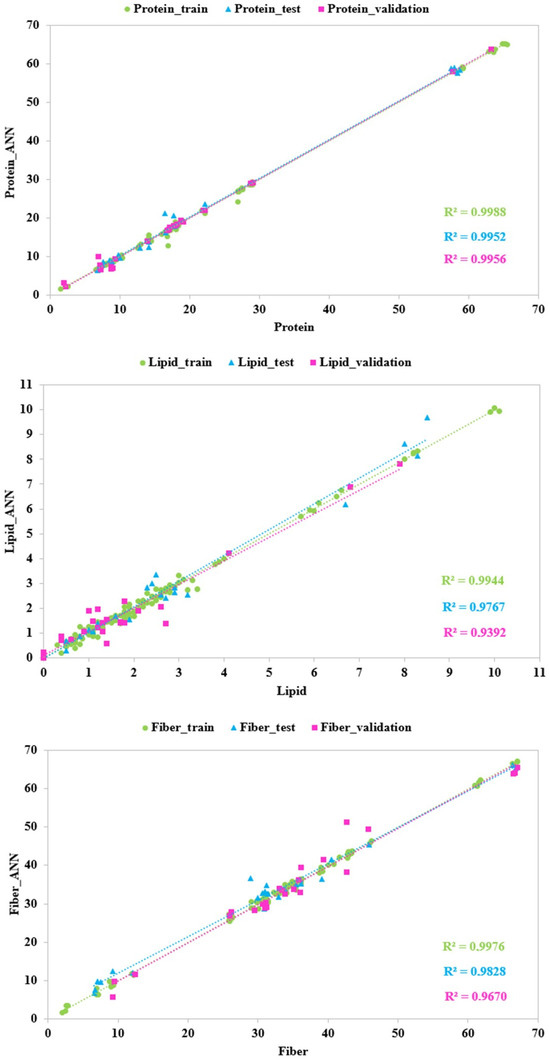 Predicted vs. experimental values of the protein, lipid, and fiber contents using the optimal ANN topologies and first-derivative transformed SWIR spectra. The coefficients of determination (R2) for the training, test, and validation sets are reported.