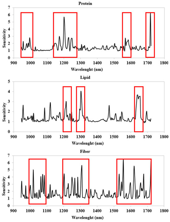 A high predictive accuracy was also found for best model of fiber content, developed with 10 neurons in the hidden layer, an exponential function for the hidden neurons, and an identity function for the output neurons. In fact, metrics for the test set were 0.9914, 0.9828, 2.3032, 0.7968, and 7.5954 for r, R2, RMSE, MAE, and RSE, respectively. Sensitivity analyses highlighted the wavebands that exhibited the best predictive ability for fiber content (Figure 5). The spectra regions that contribution to the model development can be attributed to O-H bending and C–H stretching (characteristic of wave lengths between 1000 nm and 1100 nm), C–H stretching (characteristic of spectral bands between 1200 nm and 1350 nm), C–H3, C–H2, and C–H stretching (characteristic of wave bands between 1550 nm and 1720 nm), which mainly form carbohydrates [52,53].